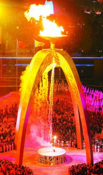 ▲ 第十六届亚运会开幕式主火炬熊熊燃烧。