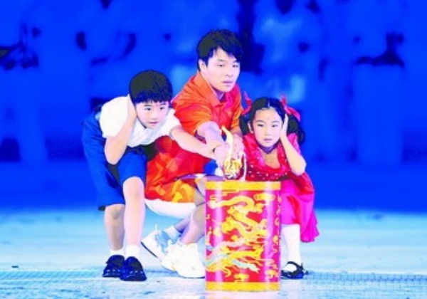 ▲ 第十六届亚运会开幕式上,火炬手何冲(中)与儿童熊钰翔(左)、陈佳雨一起点燃引燃主火炬的中国传统爆竹。