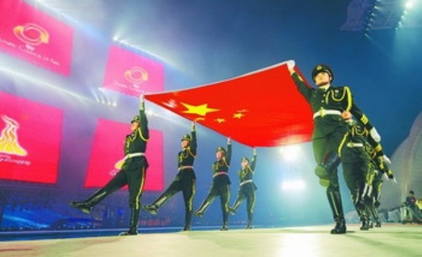▲ 第十六届亚运会开幕式上,八名仪仗队执旗手手执国旗。