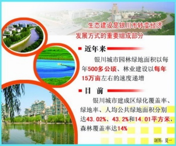 生态建设是银川市转变经济发展方式的重要组成部分。几年来,依靠科学定位、深度挖潜、锐意改革,银川的城市园林绿地面积以每年500多公顷、林业建设以每年15万亩左右的速度递增,城市建成区绿化覆盖率、绿地率、人均公共绿地面积分别达43.02%、43.2%和14.01平方米,森林覆盖率达14%。