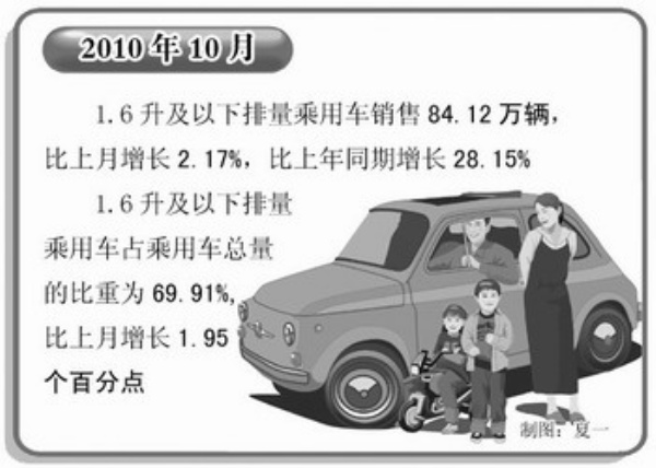 1.6升及以下排量乘用车市场份额有所提高。10月,1.6升及以下排量乘用车销售84.12万辆,比上月增长2.17%,比上年同期增长28.15%;1.6升及以下排量乘用车占乘用车总量的比重为69.91%,比上月增长1.95个百分点,比上年同期增长0.56个百分点。而且,该类车型市场份额已连续3个月出现回升态势。究其原因,中国汽车工业协会认为,一是年底购置税优惠政策到期促进了该类车型的销售,二是节能产品补贴政策的积极影响,目前已有206款1.6升及以下排量乘用车进入“节能产品惠民工程”节能汽车推广目录。