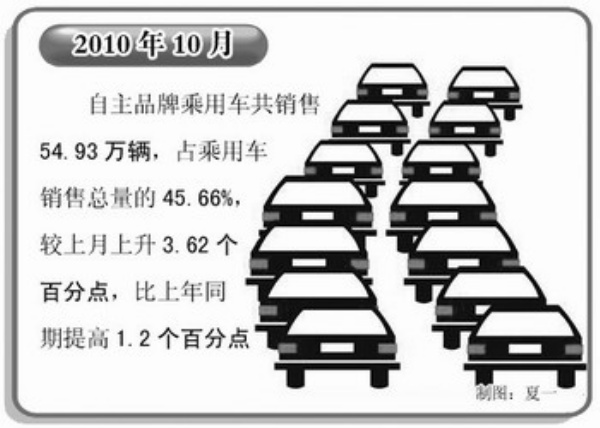 自主品牌乘用车表现突出。10月,自主品牌乘用车共销售54.93万辆,占乘用车销售总量的45.66%,较上月上升3.62个百分点,比上年同期提高1.2个百分点。1至10月,自主品牌乘用车共销售503.81万辆,占乘用车销售总量的45.39%,比上年同期提高1.18个百分点。