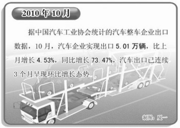 在海外市场有所作为,是中国汽车企业努力的方向。伴随着海外市场的逐步恢复,我国汽车出口保持了高速增长。据中国汽车工业协会统计的汽车整车企业出口数据显示,10月,汽车企业实现出口5.01万辆,比上月增长4.53%,同比增长73.47%,汽车出口已连续3个月呈现环比增长态势。1至10月,出口前五名的整车制造企业分别为奇瑞、长安、长城、东风和北汽,前五家企业出口量占出口总量的比重为56.73%。 文/本报记者 常艳军