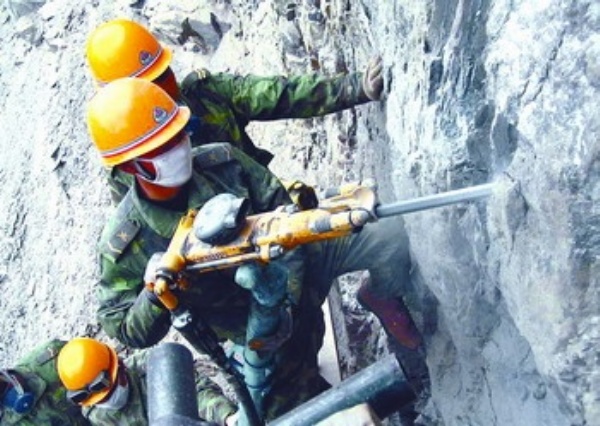 生存环境异常险恶,施工难度更是超出想象。工程掘进阶段,风钻手举着30公斤重的风钻在岩壁上打孔,几分钟手臂就会酸软无力。岩石粉尘从钻孔中喷射而出,打在脸上。岩石爆破后的硝烟和碎石打得人睁不开眼、喘不过气,许多官兵窒息晕倒,醒来后,用水打湿口罩,又冲进硝烟。