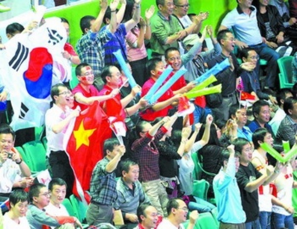 | 下图 11月15日,广州亚运会羽毛球男团决赛在天河体育馆举行,拉拉队在为中韩两国羽毛球选手加油助威。
