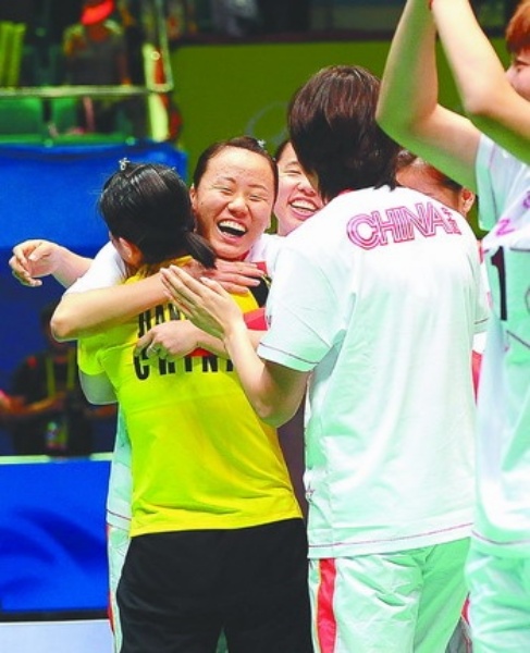 | 右图 11月15日,在亚运会羽毛球女子团体决赛中,中国队以3比0战胜泰国队,获得金牌。中国选手们在庆祝夺冠。