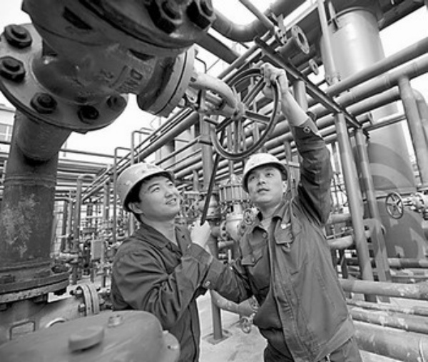 工人在山西永鑫煤焦化公司甲醇厂前操作。该公司利用焦化尾气生产甲醇,有效解决了焦炉煤气的排放污染问题。近年来,山西安泽县大力发展循环经济,推进煤矿技术改造,取得显著成效。 本报记者 赵 晶摄