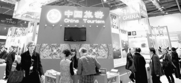 人们在英国首都伦敦举行的世界旅游交易会上参观中国展区。 一年一度在伦敦举行的世界旅游交易会是世界上规模最大的旅游交易会之一。2010年世界旅游交易会于日前举行,来自全球187个国家和地区的5000多家旅游机构参加。 新华社记者 曾 毅摄