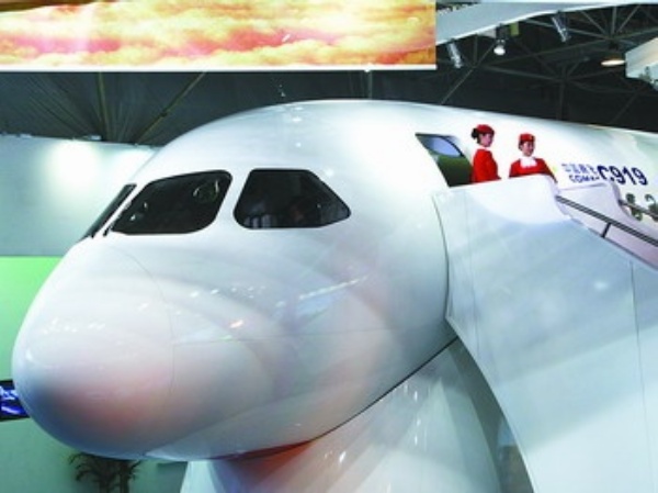 国产C919大型客机展示样机在珠海航展展馆首次揭开神秘“面纱”。展示样机包括驾驶舱和客舱前半段,前两排是头等舱,后边是经济舱。样机尺寸与真实飞机的比例为1:1,全长17米,高度5.6米,宽度为3.96米。 新华社记者 张 毅摄