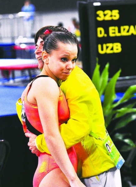 图② 11月17日,在女子平衡木决赛中,一名乌兹别克斯坦体操选手在比赛中出现失误,赛后教练安慰队员。