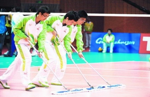 图4: 亚运会赛场上,经常能看到志愿者的身影。他们细致周到的服务让运动员倍感亲切。 本报记者 赵 晶摄