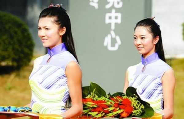图5: 11月17日,颁奖礼仪志愿者在奥体射击馆的颁奖典礼上。 新华社记者 燕 雁摄
