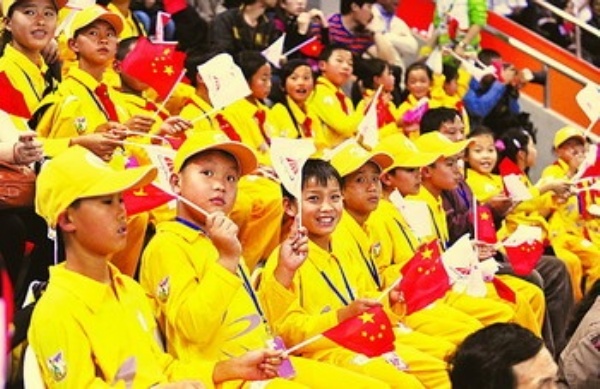 图6: 赛场内观众有组织地观看比赛,大家统一服装,为运动员加油鼓劲。 本报记者 赵 晶摄