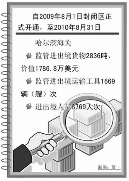 据统计,自2009年8月1日封闭区正式开通,至2010年8月31日,哈尔滨海关共监管进出境货物2836吨,价值1786.8万美元,监管进出境运输工具1669辆(艘)次,进出境人员8769人次。至此,中俄原油管道的关键性工程————黑龙江穿越工程已顺利竣工,海关为此也交出了一份令人满意的答卷!