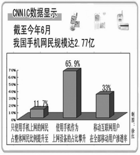 企业纷纷在发展策略上逐步向移动互联网倾斜,看重的是移动互联网巨大的市场空间。根据中国互联网络信息中心(CNNIC)发布的《第26次中国互联网络发展状况统计报告》,截至今年6月,我国手机网民规模达2.77亿,其中只使用手机上网的网民占整体网民的比例提升至11.7%,使用手机作为上网设备的占比攀升至65.9%,移动互联网用户在全部移动用户中的渗透率达到33%。手机网民在信息获取和交流沟通类应用上使用率较高。手机即时通信使用率位居首位,达到61.5%,手机搜索以48.4%的使用率排名第二。我国新增网民62%来自手机用户,仅今年上半年就新增了4334万手机网民。据易观国际预测,今年年底移动互联网用户数将突破3亿,市场营收达到633亿元左右。