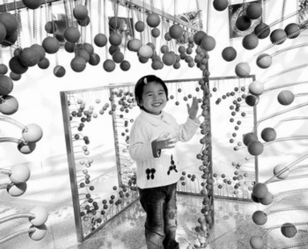 11月13日,在首届国际纳米科普艺术展上,一名小观众站在用不锈钢、橡胶球及弹簧等制作的“魔架”中。 当日,首届国际纳米科普艺术展在江苏省苏州市科技艺术文化中心开幕,共展出全国十余所高等院校选送的500余件作品、特邀艺术家创作的20余件作品以及由科学家提供的百余幅科研科普图片,用艺术作品展现纳米科学的无穷魅力。 王建中摄 (新华社发