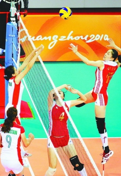 图① 11月18日,在女子排球小组赛中,中国女排与塔吉克斯坦队进行比赛。