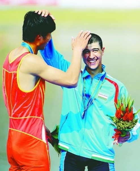 图④ 11月18日,中国选手孙昭稳(左)与乌兹别克斯坦选手在颁奖仪式上互相致意。 新华社记者 吴晓凌摄