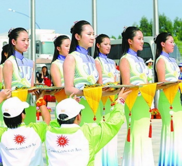 图⑤ 11月18日,龙舟比赛是多选手比赛项目,装奖牌的托盘沉重,志愿者(下)在帮助颁奖礼仪志愿者托举托盘。