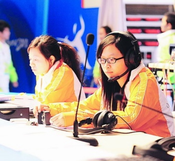图⑥ 亚运会赛场上,工作人员正在进行现场播报。 本报记者 赵 晶摄