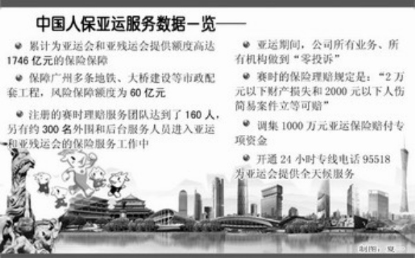 据了解,在亚运会和亚残运会筹办和举行过程中,中国人保将累计提供额度高达1746亿元的保险保障。同时为配合广州办好亚运会,中国人保还为广佛地铁、广州4号线、3号线北延、2号线南延等地铁建设项目,海怡大桥(南海—番禺)的建设以及广州、佛山市路面改造等市政配套工程提供了建筑工程保险、财产保险等高达60亿元的保险保障。