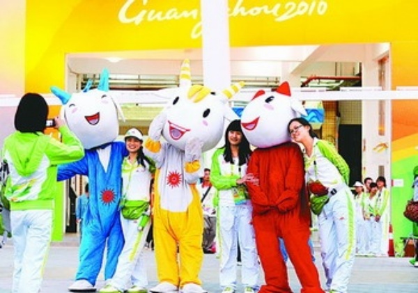 图④ 11月19日,志愿者在工作间隙与亚运会吉祥物合影。