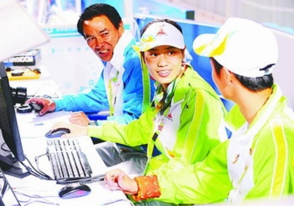 图⑤ 11月19日,志愿者在工作中。亚运会开赛以来,志愿者们高效、周到的服务得到了运动员的好评。