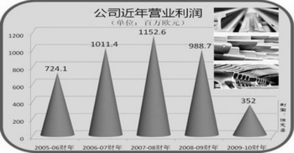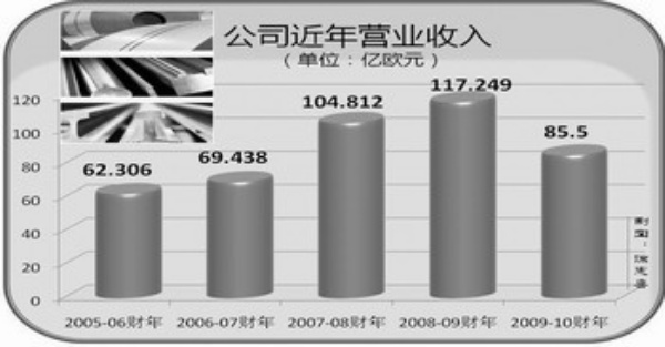 实施降低成本计划后,奥钢联的企业利润已连续4个季度保持快速增长。本财年一季度同比增长22.1%,环比增长13.1%。同时,奥钢联的利润率已经连续7个季度在欧洲同行业企业排名中名列榜首。降低成本后,奥钢联在汽车钢材领域的竞争力显著增强,其收入占公司总收入的比例达到30%,而欧洲同行业在该领域的收入所占比例一般只有15%左右。同时,铁轨系统钢材产品的竞争力也得到了加强,继续保持了在国际铁轨系统市场中的领军地位。2009—2010财年,奥钢联的流动资金历史上首次超过10亿欧元,企业资产负债率也从上一年度的88%下降到71%。今年一季度,公司的自有资本环比继续增长了4.1%,达到44.36亿欧元,企业资产负债比率也进一步降低到67.2%。