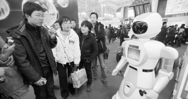 11月20日,观众与高科技语音互动气象服务机器人对话。当日,2010信息化与现代农业博览会在北京全国农业展览馆开幕,这是我国举办的农业信息化领域最高规格、最具特色的全国性博览会。 陈晓根摄(新华社发)