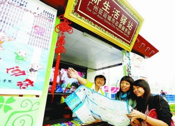 图② 11月20日,亚运会赛场外,志愿者在为游客指路。