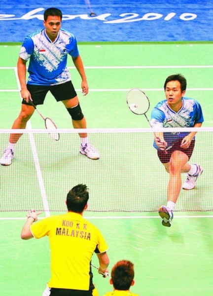 图⑤ 11月20日,在羽毛球男子双打决赛中,印度尼西亚选手马尔基斯·基多/亨德拉·塞蒂亚万夺得金牌。