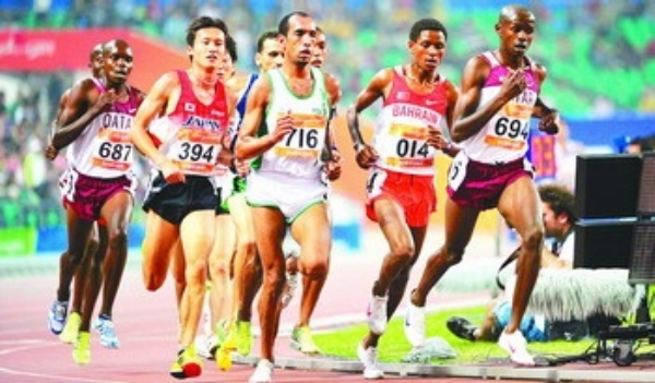 图① 11月21日,选手们在男子5000米决赛中。最终,巴林选手夺得金牌。 本报记者 赵 晶摄