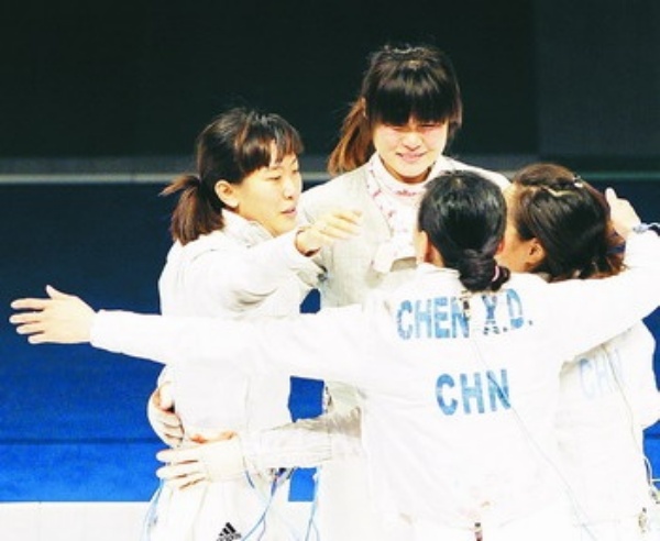 图② 11月21日,中国队选手谭雪(左一)和队友庆贺胜利。当日,在女子佩剑团体决赛中,中国队夺得冠军。