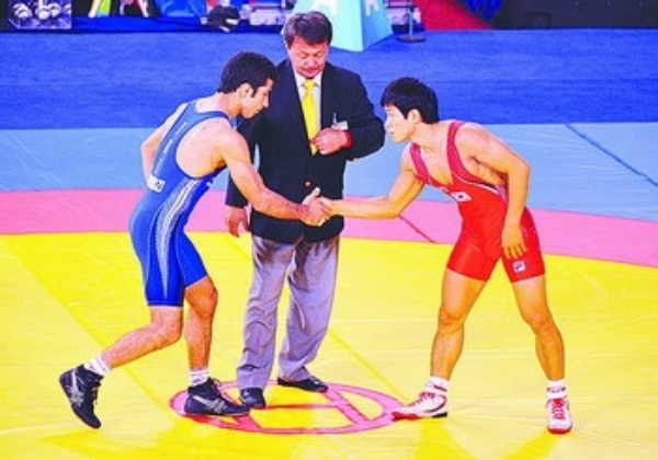 图③ 11月21日,在男子古典式摔跤60公斤级决赛中,伊朗选手奥米德·努鲁齐(左)夺得金牌。 本报记者 赵 晶摄