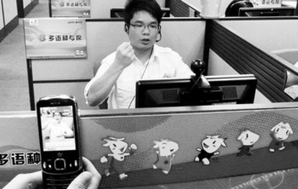 图1: 10086手语客服代表刘达聪正在演示基于3G技术的手语视频服务。 本报记者 陈 静摄