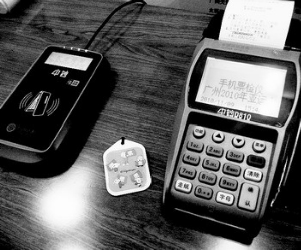 图3: 图中小小的塑料卡,是在广州亚运会上使用的手机门票。 本报记者 陈 静摄