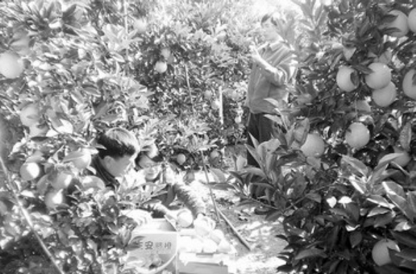 近年来,江西遂川县左安镇大力调整产业结构,通过政策扶持、资金奖补、示范带动等措施,引导农民发展“一村一品”脐橙特色产业。目前该镇已建立百亩脐橙示范基地2个,带动发展种植户100余户,种植面积达到2000多亩。图为11月16日,该镇白云村村民采摘成熟的脐橙。 赖永峰 刘小群摄影报道