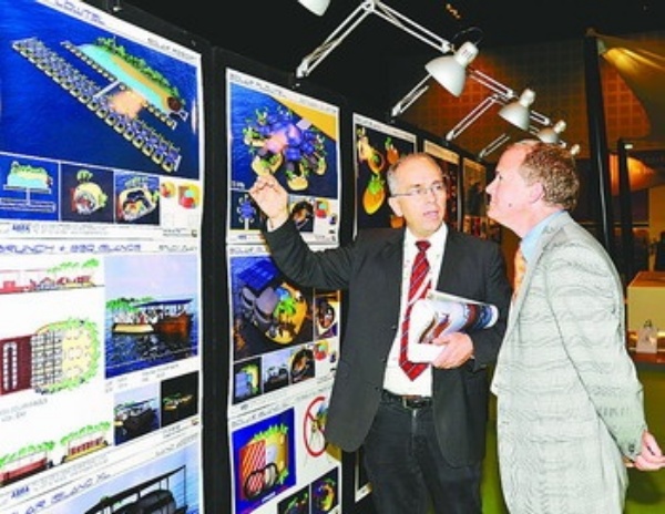 第一届阿布扎比国际绿色旅游展日前在阿联酋首都阿布扎比国际展览中心举办,来自世界各地的旅游从业者就如何开发环保旅游资源这一当前业界最关注的主题进行了交流与探讨。图为迪拜当地一家旅游产业开发公司工作人员在向参观者讲解该公司最新推出的海上环保度假村创意方案。 本报驻阿布扎比记者 经凯摄影报道