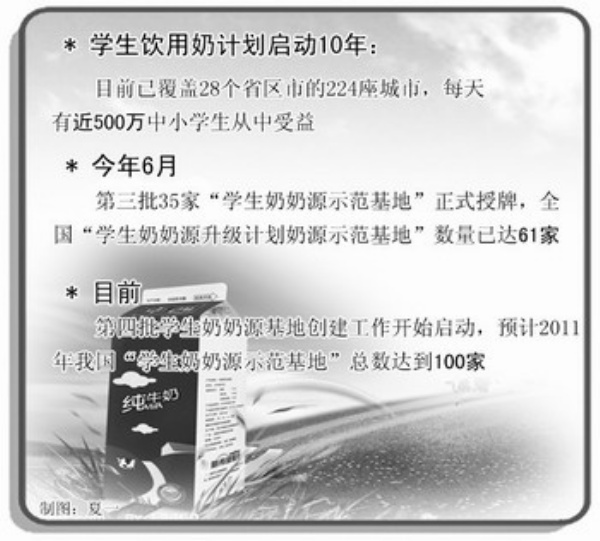 国家学生饮用奶计划实施10年来,学生饮用奶覆盖范围逐步扩大,已在1万多所中小学校推广,日供奶量也已接近500万份,对提升中小学生身体素质、促进奶业发展起到了积极作用。