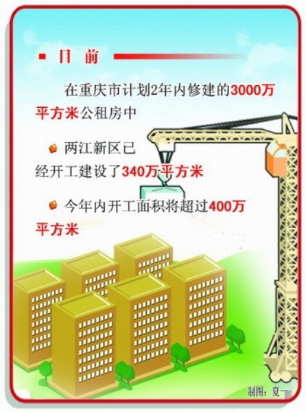 目前,在重庆市计划2年内修建的3000万平方米公租房中,两江新区已经开工建设了340万平方米,加上位于龙兴的70万平方米,今年内开工面积将超过400万平方米。最终,两江新区范围内的公租房将达到1000万平方米的规模,占全市计划的三分之一。