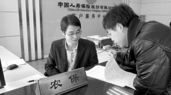 图: 中国人寿的新农保工作人员正在为来访者耐心讲解。