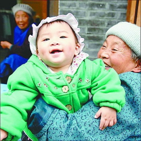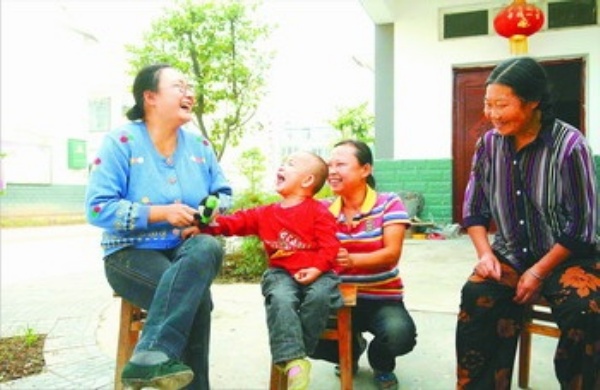 图1: 四川绵阳安县柏杨村,村民李双红(右二)一家在新家门前。经过辽宁省的对口援建,如今的柏杨村,占地85亩、集中安置158户受灾群众的农村社区已全部建成,社区用上了风光互补LED路灯,家家户户装上了太阳能热水器。