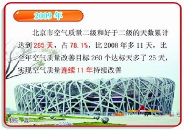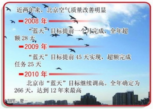 2005年,北京的“蓝天”数量为234天;进入“十一五”后,2006年为241天,2007年为246天,2008年为274天,2009年12月31日,北京在灿烂的阳光里收获了全年第285个蓝天,比“奥运年”多出11天。2010年空气质量达标目标为266天,为12年来最高目标,却仍然不是最后的顶点———北京市环保局表示,“蓝天”目标将继续保持递增趋势,到2020年,拟达到全年总天数的85%,即超过310天。