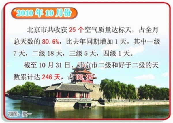 根据北京市环保局的统计数据,截至今年10月31日,北京市二级和好于二级的天数已累计达到了246天,占全年天数的80.9%,比10年前多了160多天!