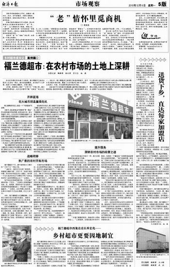 5年前,商务部大力推广“万村千乡”市场工程,福兰德集团积极响应,成为北京最早开建“农家店”的企业之一。2010年,福兰德集团已经拥有798家连锁超市,其中乡村加盟店600余家,覆盖了北京市通州区485个自然村,以及密云、怀柔、河北燕郊等地部分农村市场。