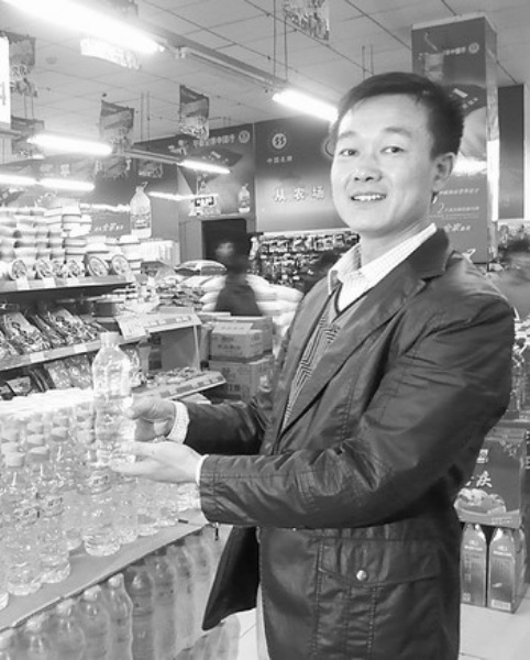 图2: 福兰德超市西集店店长单宏亮展示福兰德自有品牌纯净水。