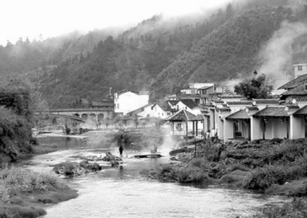 图: 湖南汝城热水镇具有丰富的温泉资源,温泉开发带动了当地旅游业发展。粉墙白瓦,小桥流水,浓雾锁山,热气袭人,构成了一幅美丽和谐的乡村水墨画。