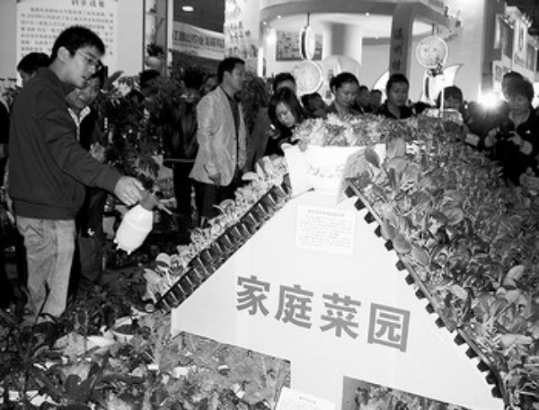 近日落幕的第四届中国(温州)特色农博会上展出的“家庭菜园”,利用速生绿色活体蔬菜技术,种植的蔬菜存活期长,可观赏,可鲜食,无公害。很多市民围着询问种植方法,也想在自家阳台上种植。 本报记者 张 玫摄