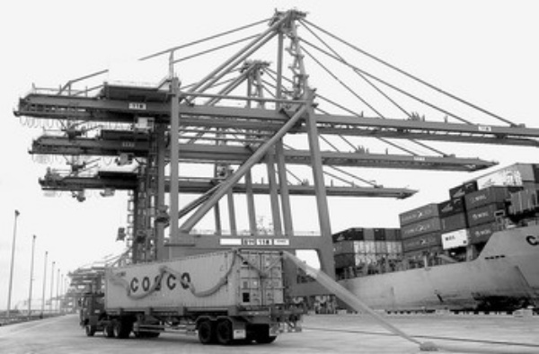 12月6日,一辆货车在运送上海外高桥六期码头开港后的首只集装箱。当日,上海港首个具备汽车滚装和集装箱运输两大主题功能的综合性港区————外高桥六期码头正式开港投产。 新华社发