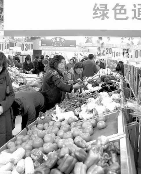 12月6日,市民在山西省运城市一家大型超市选购蔬菜。近日,山西省运城市在市区各大超市开通了“农民专业合作社”供菜绿色通道,让当地“农民专业合作社”生产的蔬菜通过“绿色通道”直接进入超市,减少流通环节成本,以低价菜供应市民。 薛 俊摄(新华社发)